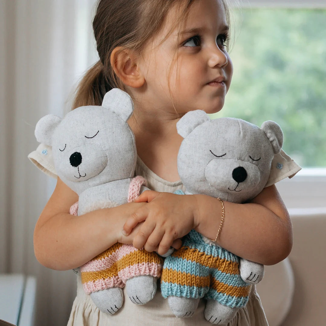 Edna bear is made with wool blend fabric and wears mustard & pink Australian merino wool overalls.