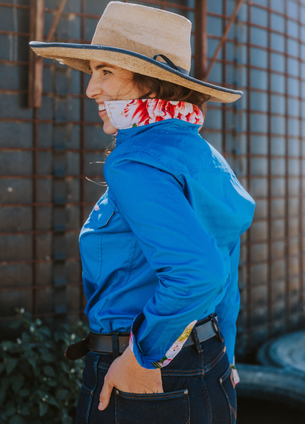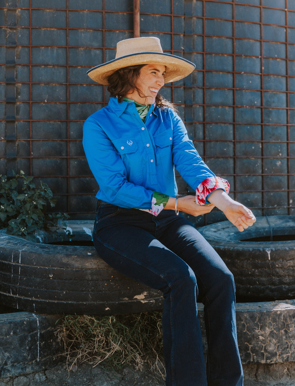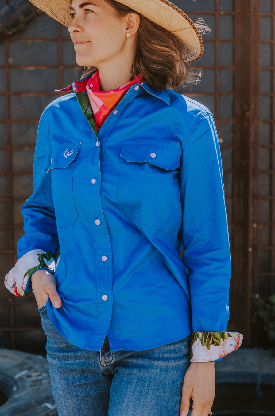 Our royal blue Alice shirt is your new wardrobe staple with an eye-catching floral collar and cuff print, large double chest pockets, and a relaxed fit that's long in the body and arms. Tuck her into a pair of jeans or shorts and off you go!