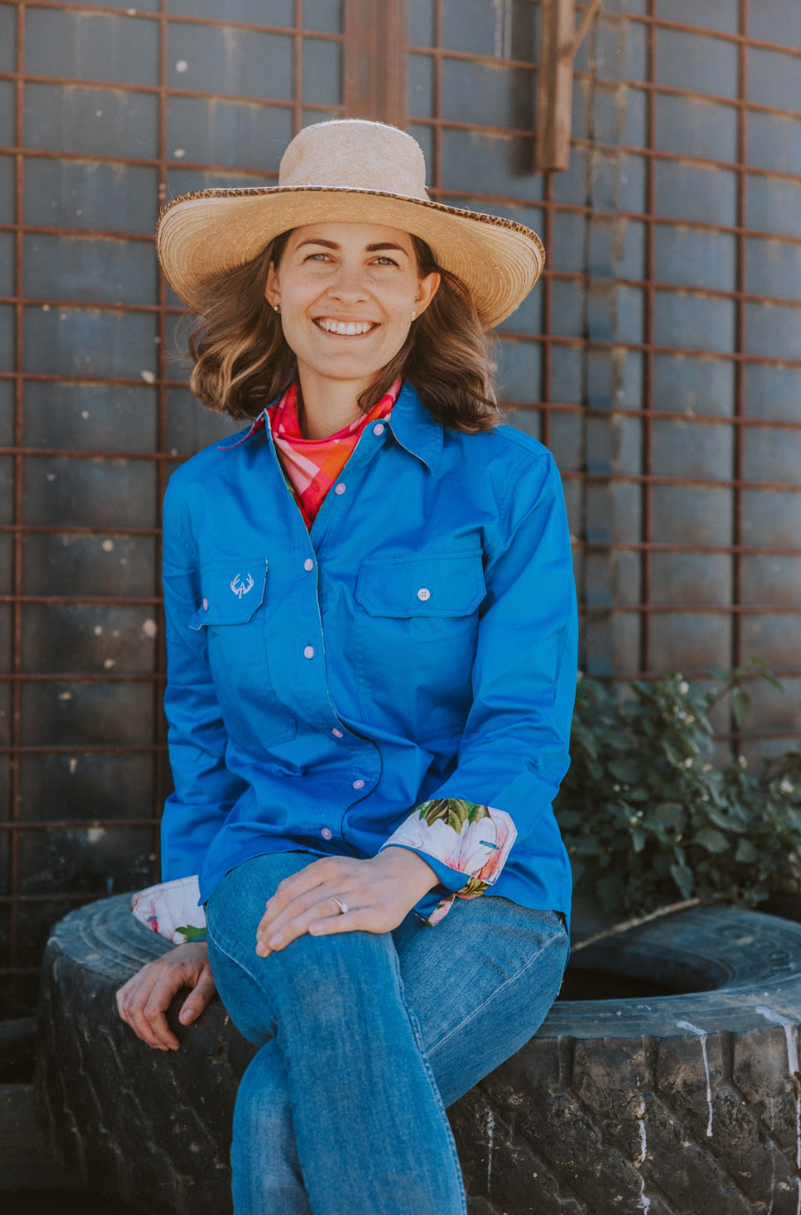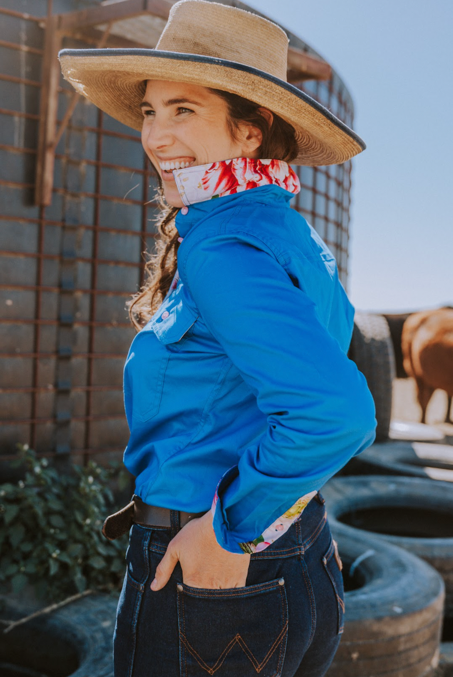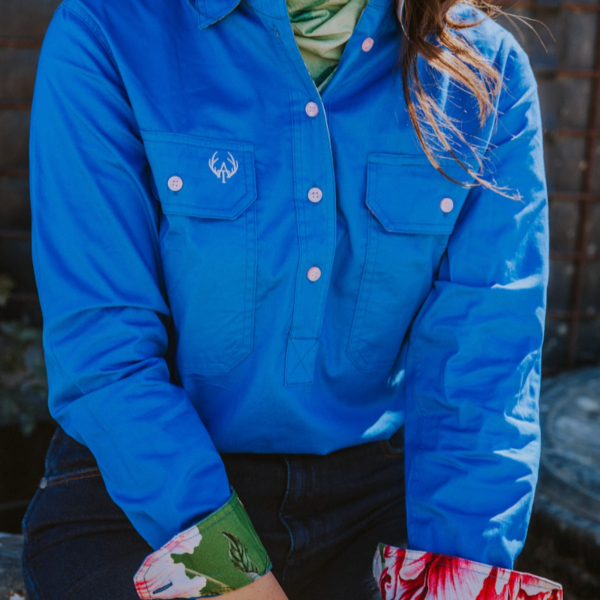 Our royal blue Alice shirt is your new wardrobe staple with an eye-catching floral collar and cuff print, large double chest pockets, and a relaxed fit that's long in the body and arms. Tuck her into a pair of jeans or shorts and off you go!