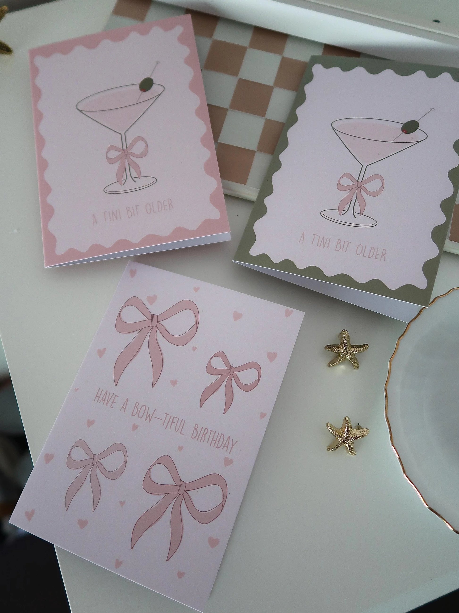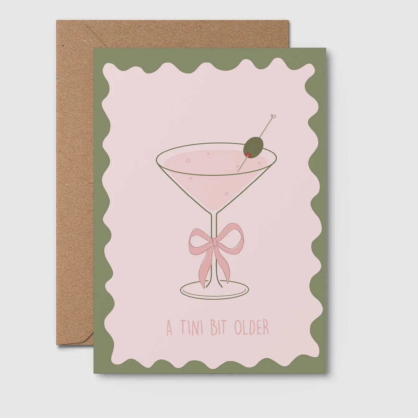 Raise a glass to another fabulous year with this playful coquette-inspired birthday card! Featuring a chic martini glass adorned with a pink bow and the fun message "A Tini Bit Older," this card is the perfect mix of stylish and witty. Ideal for the birthday girl who loves a little glam and humour