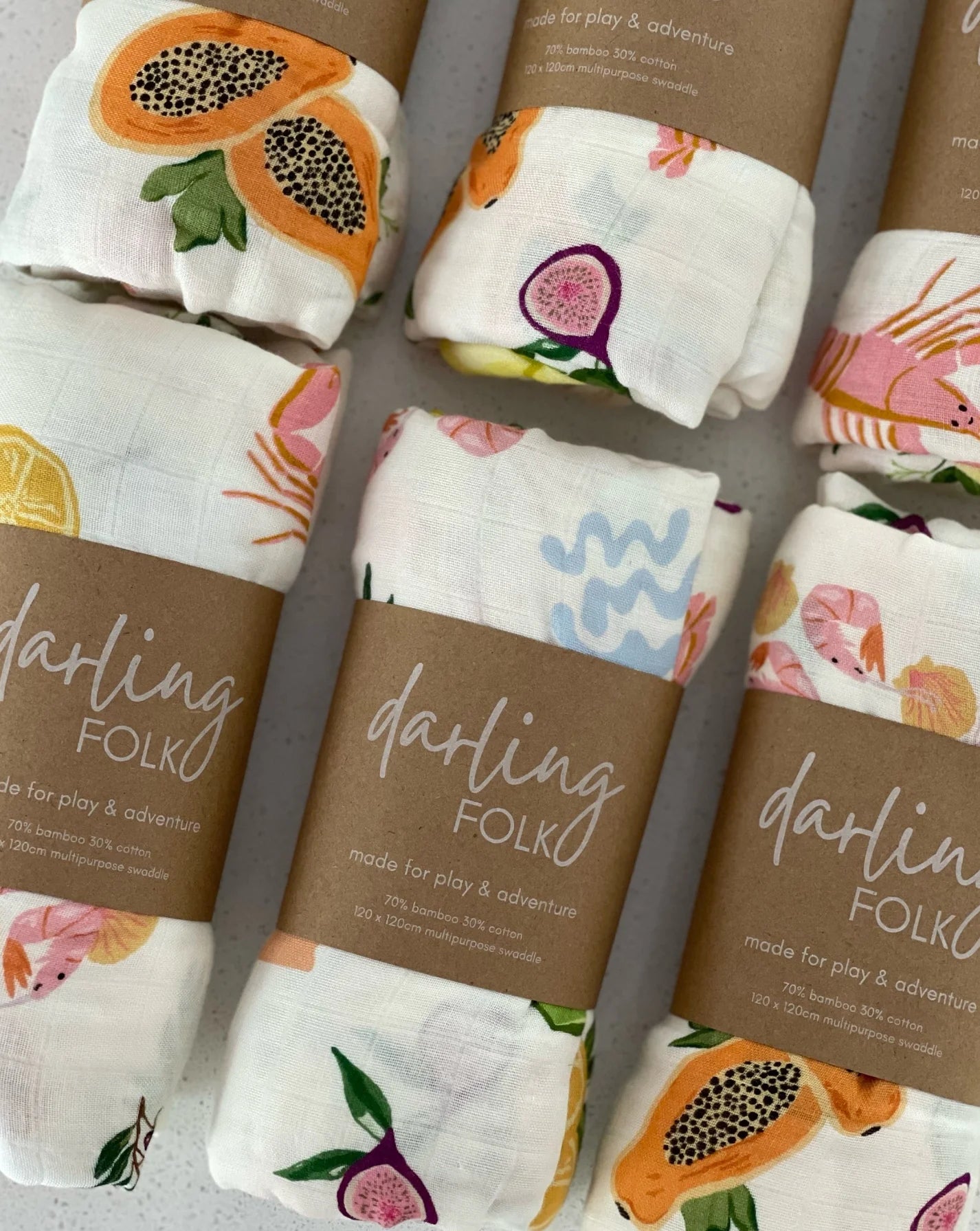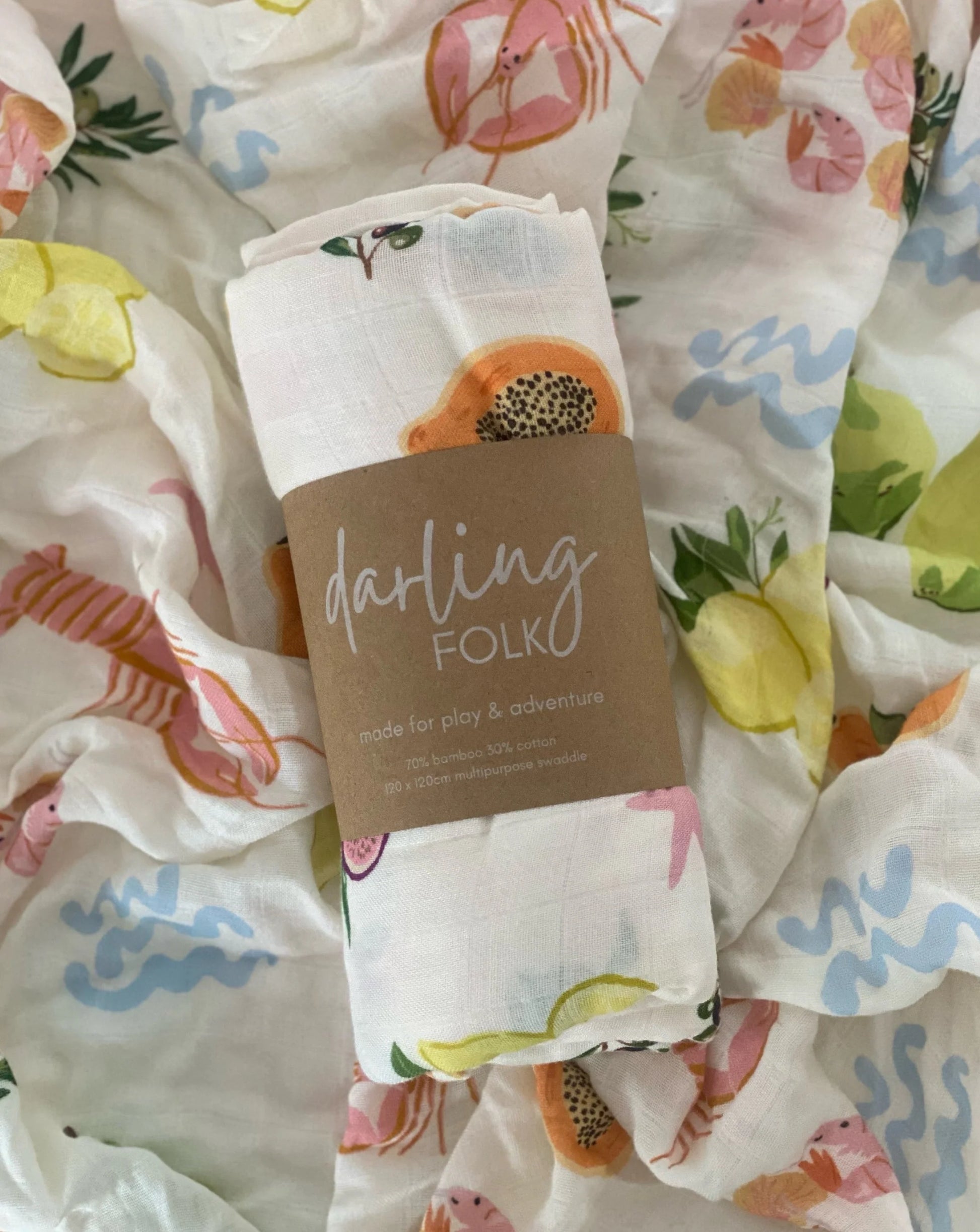 Our "Luca" swaddle, features a vibrant, playful and unique print designed exclusively for Darling Folk by a local Central Coast artist. Inspired by the Mediterranean, with its playful elements such as lemons & lobsters, this swaddle is perfect for adding a pop of colour and fun to your little one's world.