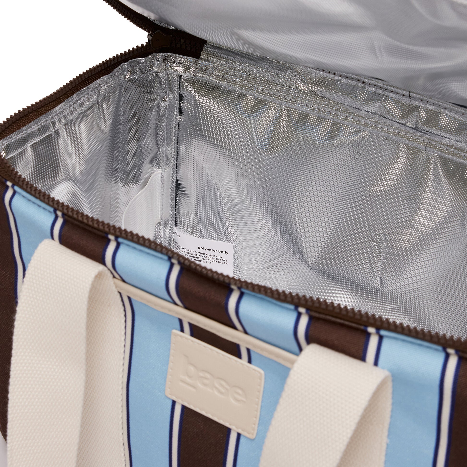 Add coastal cool to your beachside essentials. Compact cooler made from durable water resistant fabric perfectly sized to hold bottles, cans and snacks. Considered details like the chunky zip closure and outside pockets keep things cool and contained. Removable and adjustable cotton crossbody strap makes for convenient carrying.