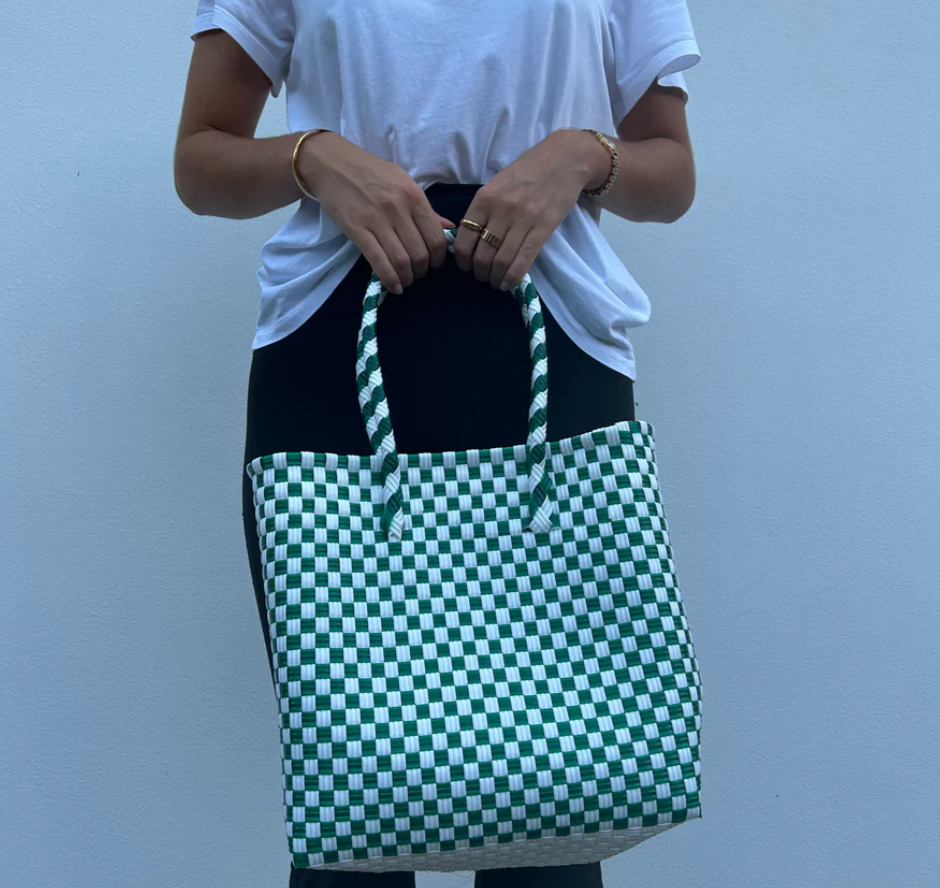 Elevate your style with the classic Ollie in deep green and white check. Fun, sustainable and durable, we have developed these bags alongside skilled artisans using recycled PET plastic. Due to the nature of the materials and the handmade process, slight imperfections and colour differences may occur, making each product unique and special.