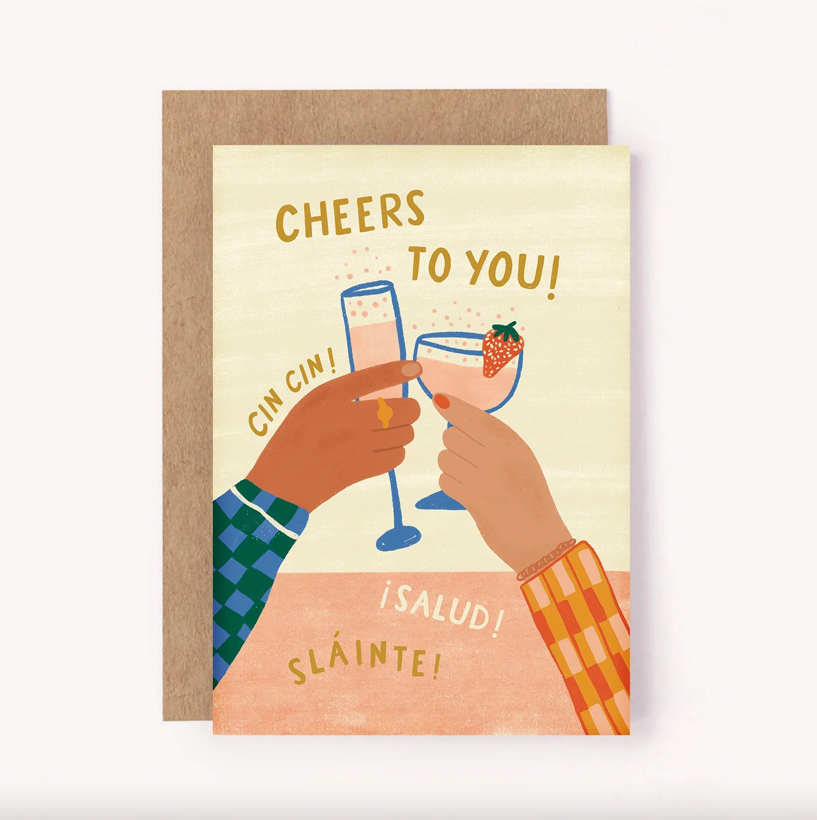 Illustrated "Cheers to You!" birthday card. This birthday card features two clinking glasses and hand-lettered "Cin Cin!" "Salud" and "Slainte!" - a perfect birthday toast! Blank inside for a personal message